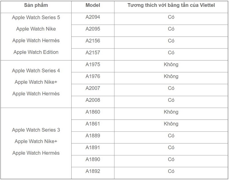 Bảng thống kê các model Apple Watch tương thích với băng tần của Viettel: