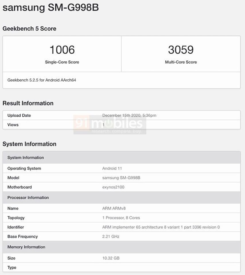 phiên bản Galaxy S21 Ultra xuất hiện trên Geekbench đi kèm với số model là SM-G998B. Tại đây, điện thoại này được phát hiện sử dụng chipset Exynos 2100, có 8 nhân xung nhịp 2.21GHz, cho thấy đây là biến thể toàn cầu. SoC sẽ nhận được sự hỗ trợ từ dung lượng RAM lên tới 12GB và hệ điều hành Android 11 mới nhất.