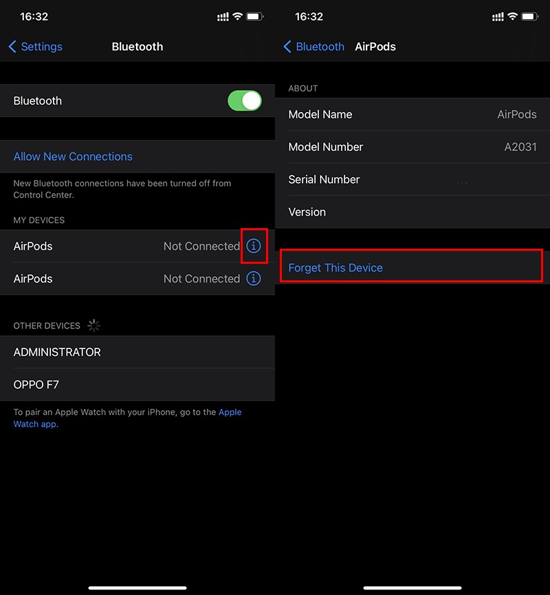 Vào Cài đặt --> Bluetooth --> Bấm vào biểu tượng chữ i bên cạnh tên thiết bị cần kết nối --> Bấm vào Quên thiết bị này. Sau đó quay lại kết nối với thiết bị đó một lần nữa.