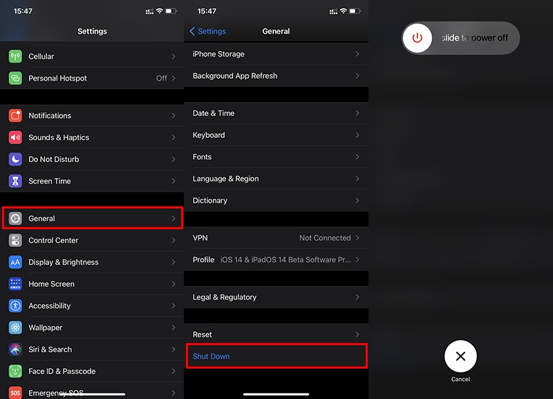 Khởi động lại iPhone dường như là cách mà nhiều người thường hay nghĩ đến nhất khi điện thoại gặp một sự cố nào đó. Cách này nhiều lúc cũng có hiệu quả với các lỗi nhỏ phần mềm. Khởi động lại iPhone bằng cách vào Cài đặt (Settings) --> Cài đặt chung (General) --> Tắt máy (Shut down)--> Trượt để tắt máy. Ngoài ra bạn có thể tắt máy bằng cách dùng phím Home ảo hoặc tổ hợp phím nút nguồn + tăng âm lượng (với các dòng máy từ X trở lên) hoặc nhấn giữ nút nguồn (với các dòng máy từ 8Plus trở xuống).