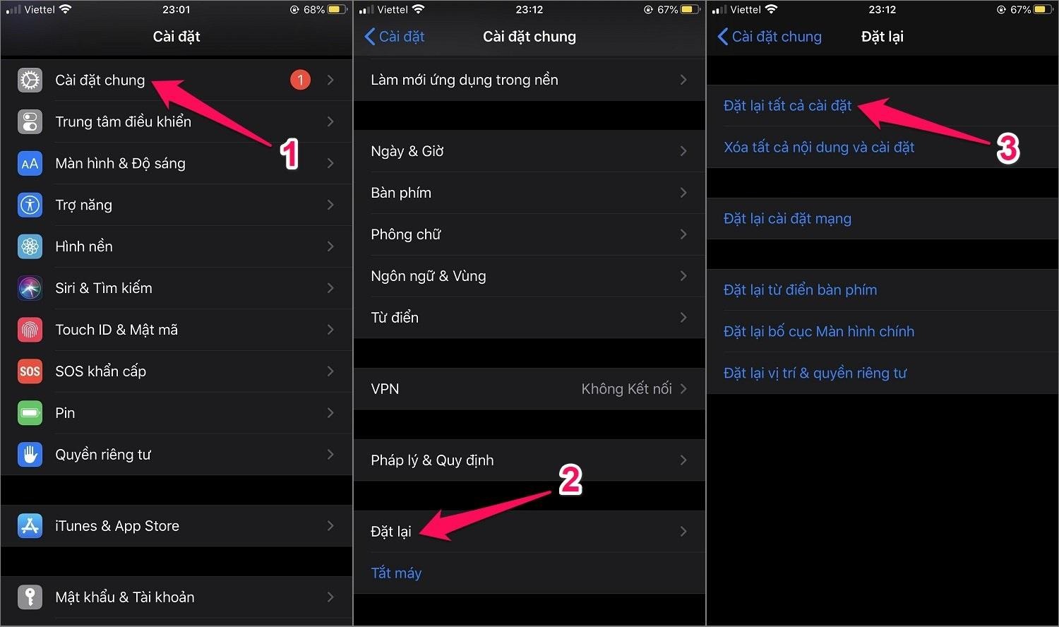 Vào Cài đặt --> Cài đặt chung --> Đặt lại --> Đặt lại tất cả cài đặt.