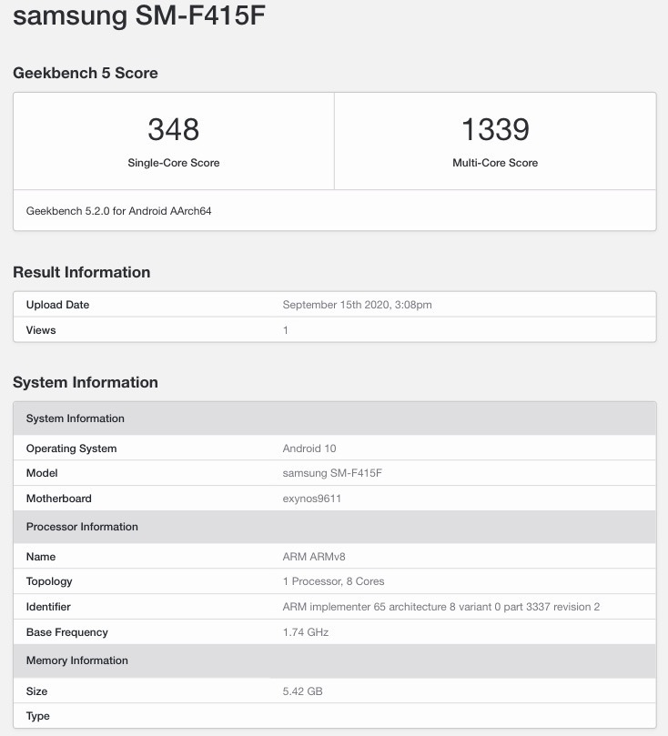 Ngoài ra Samsung Galaxy F41 còn xuất hiện trên Geekbench, cho biết máy dùng chip Exynos 9611 và có 6GB RAM. Điện thoại được cài sẵn hệ điều hành Android 10. Các tin đồn trước đó về Galaxy F41 cho rằng, thiết bị là một mẫu Galaxy M31 được cải tiến về camera. Sơ đồ thiết kế của Galaxy F41 cũng phù hợp với thiết kế của Galaxy M31.